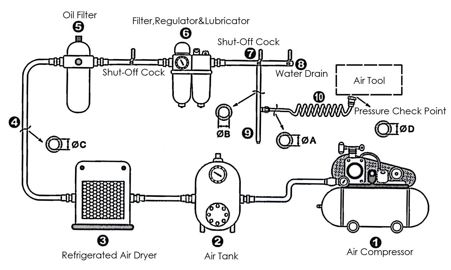 उच्च दाब पर 6.2 बार (90psi) साफ शुष्क हवा के साथ उपकरण की आपूर्ति करने से उपकरण का जीवन काफी कम हो जाता है